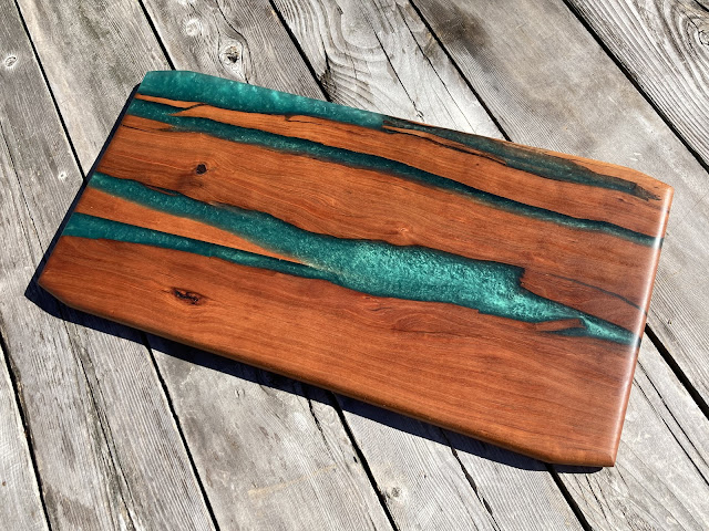 Cherry and green epoxy, this is one of our giant boards, 22 1/2” x 11 1/2”. We’ll have this one and many more this weekend at VultureFest in Makanda.